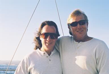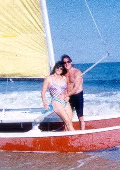All that pointing they're doing? It's because Best Man Jack and the Groom's son Shane are supposed to be following close behind in the other hobie, but are foundering in the break zone about a half mile away...